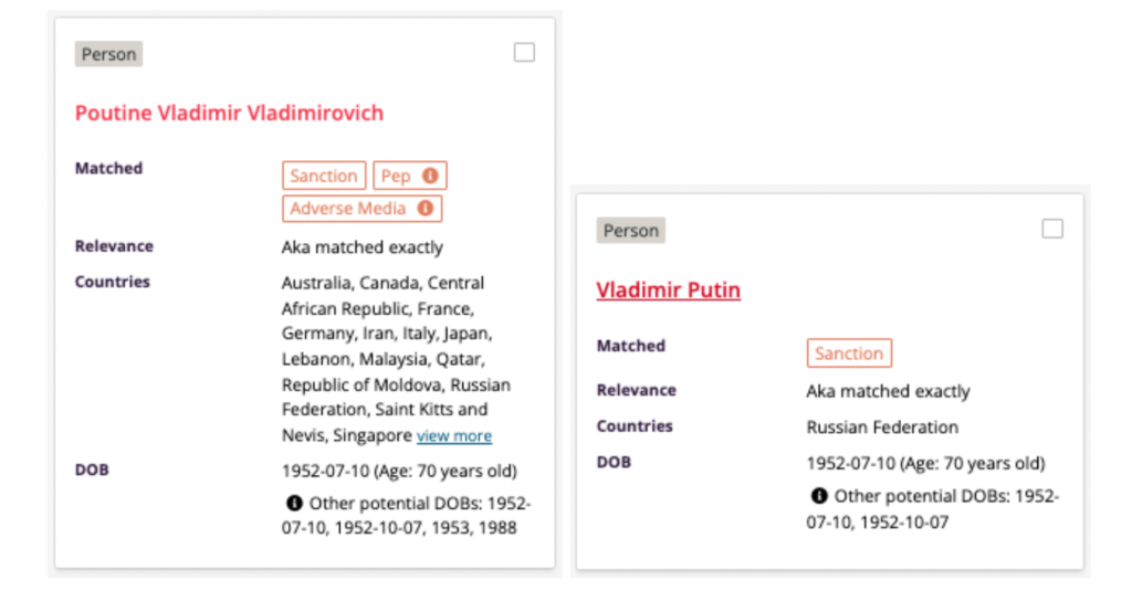 A card returned when searching sanctions only for Vladimir Putin without this behavior contains information from other sources not in the scope of the original search (on the left) and with this new behavior (on the right) only showing information from sanctions with the AKA that matched the search term: