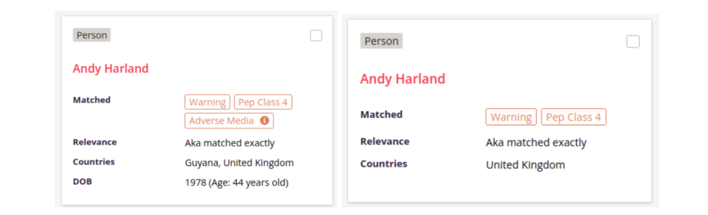 Another example below shows a card returned for a search for Andy Harland with the year of birth filter 1901 before the improvement (on the left) and after (on the right) with the information from the Adverse Media listing discounted by the year of birth search filter: