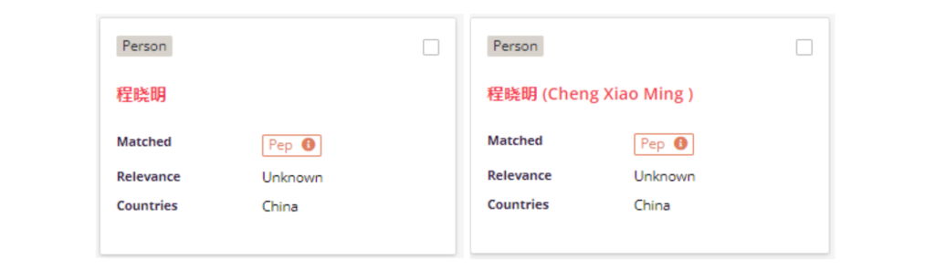 The example below shows a card returned for a search Cheng Xiao Ming before (on the left) and after the improvement (on the right):