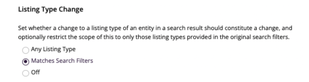 The ‘listing type change’ setting (shown below) controls whether a listing type being added or removed on a profile should generate a monitoring alert.