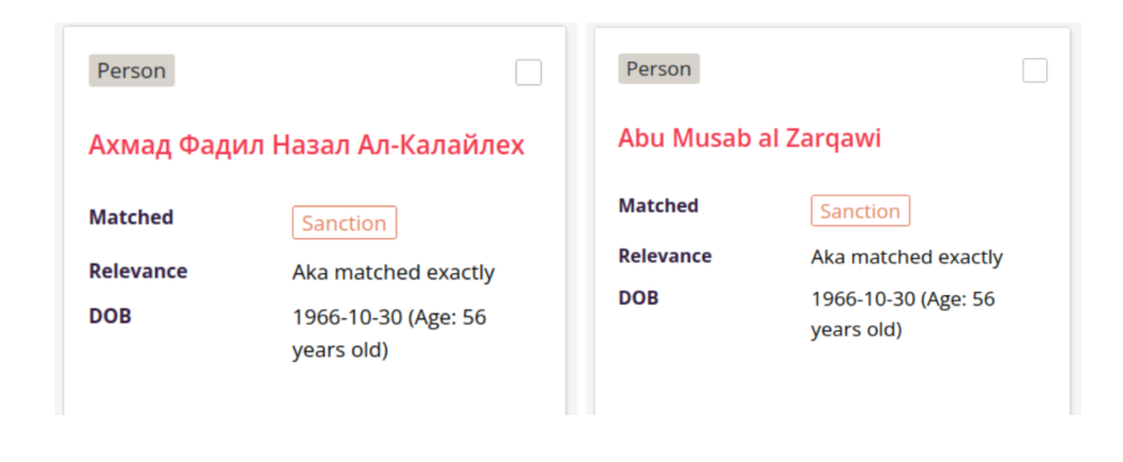 For example, a search for Abu Musab al-Zarqawibefore the change returned the card below left and after the improvement returns the same hit but displayed as shown below right, with the AKA that matched the search term: