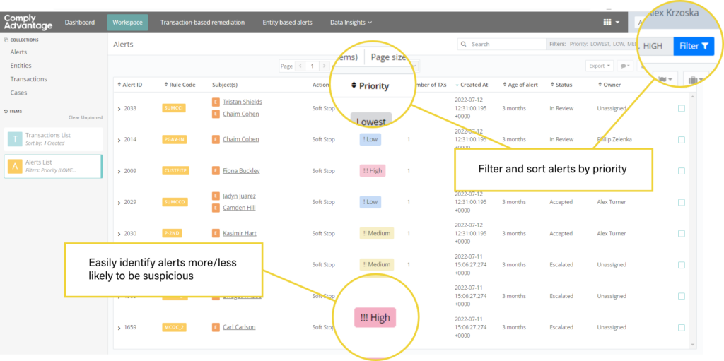 Smart Alerts can be overlayed onto existing transaction monitoring systems. Using machine learning algorithms, all alerts are automatically grouped as high, medium, or low risk. This allows alerts to be allocated and actioned accordingly. For example, high-risk alerts can be assigned and escalated to more experienced analysts and low-risk alerts can be assigned to junior analysts or bulk remediated.
