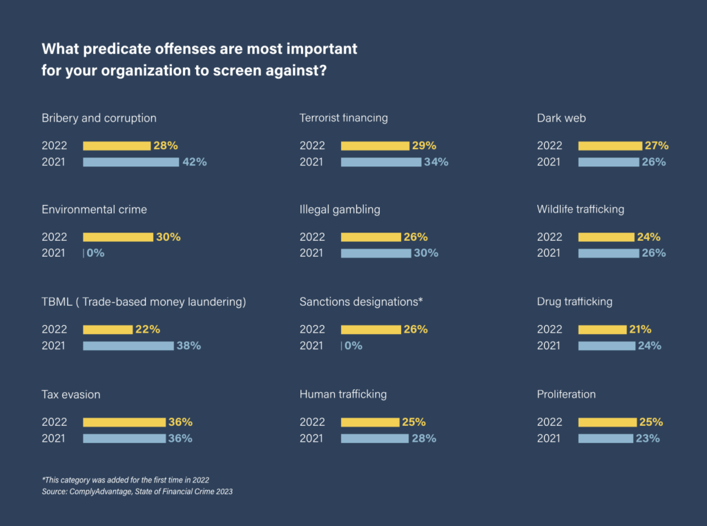 TBML takes advantage of the complex nature of trade systems, most prominently in international contexts where the involvement of multiple parties and jurisdictions make know your customer and anti-money laundering (KYC and AML) checks and customer due diligence (CDD) processes more difficult. In our State of Financial Crime Survey 2022, global compliance professionals rated TBML as the second most concerning criminal typology – behind only bribery and corruption. However, in our 2023 survey, TMBL dropped 16 points, with predicated crimes such as tax evasion, environmental crime, and terrorist financing taking the top spots. The high levels of concern around TBML in 2022 was largely due to COVID-related trade and supply chain issues, particularly in China. Since then, many firms have begun or are looking to embed supply chain risk management into their AML programs, with 45 percent of respondents saying they are focused on improving their management of supply chain risk in 2023 and beyond.